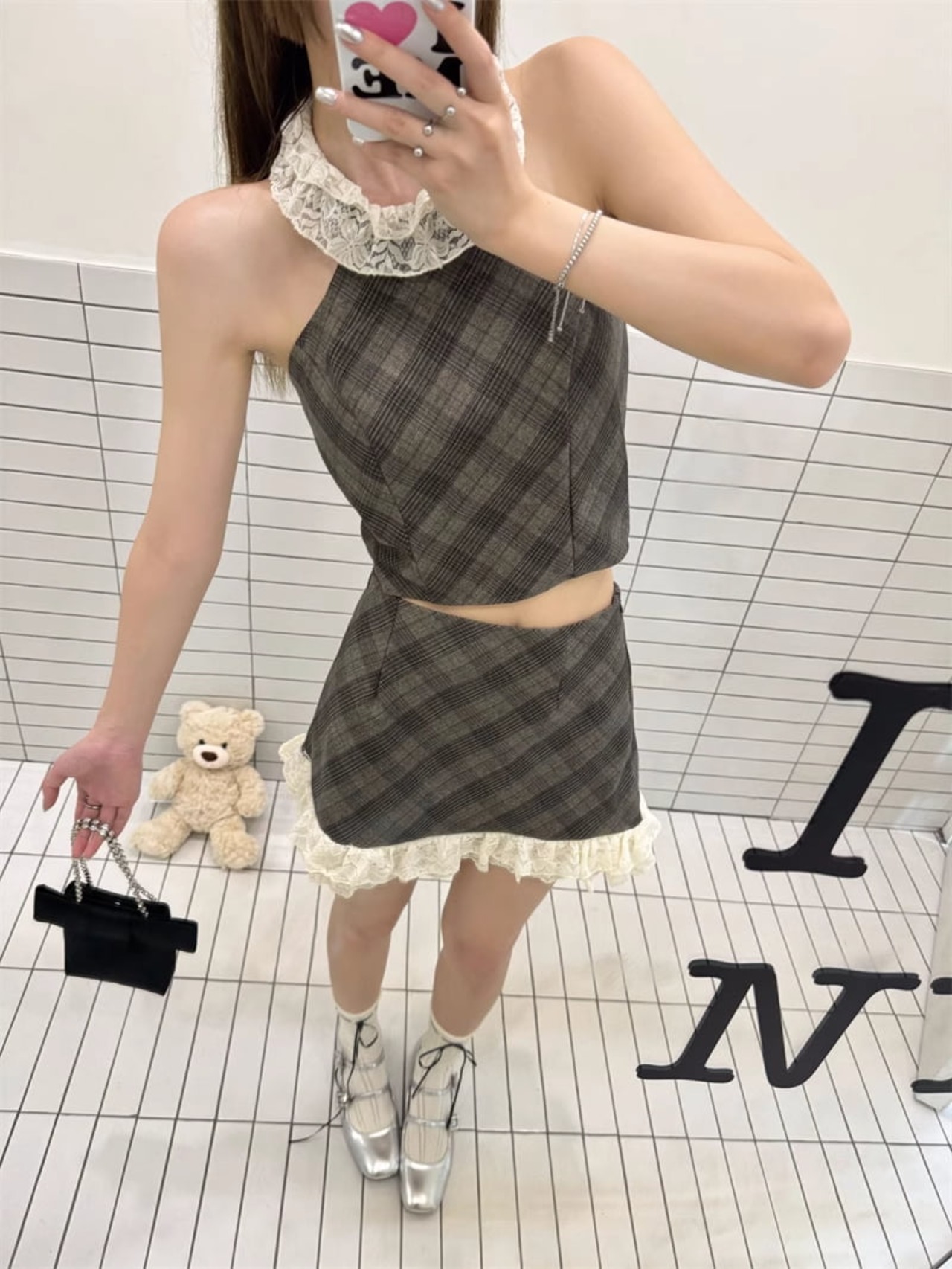 レースカラーセットアップは、エレガントなレースとクラシックなチェック柄が絶妙に組み合わさったアイテム。