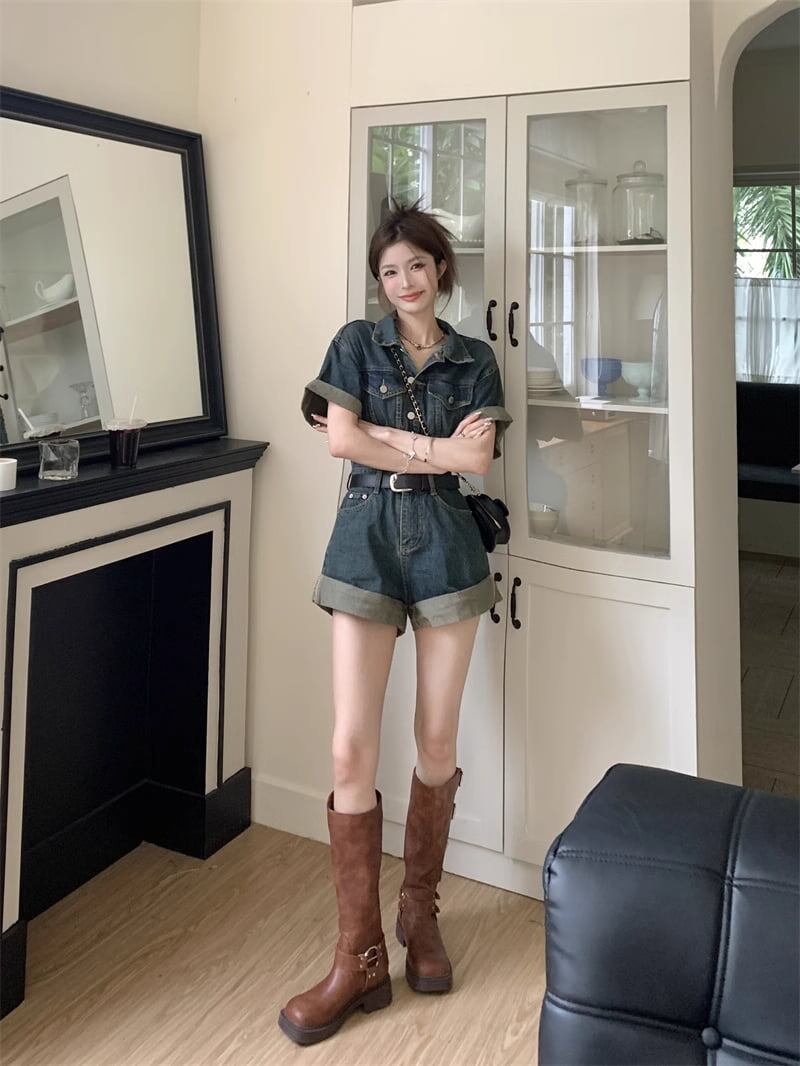 デニムショートジャンプスーツは、カジュアルでありながらスタイリッシュな一枚。